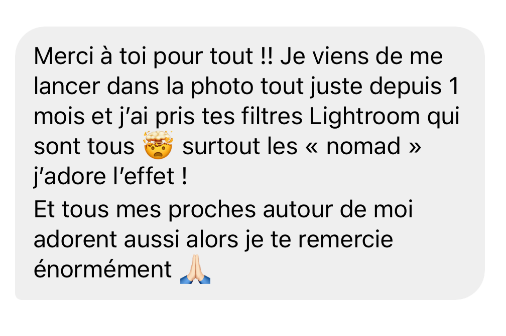 Avec cette formation, tu as également accès à TOUS mes filtres photos et donc tu pourras télécharger les packs Bali, Nomad, Travel, Classic et After Dark. (Valeur : 140€)