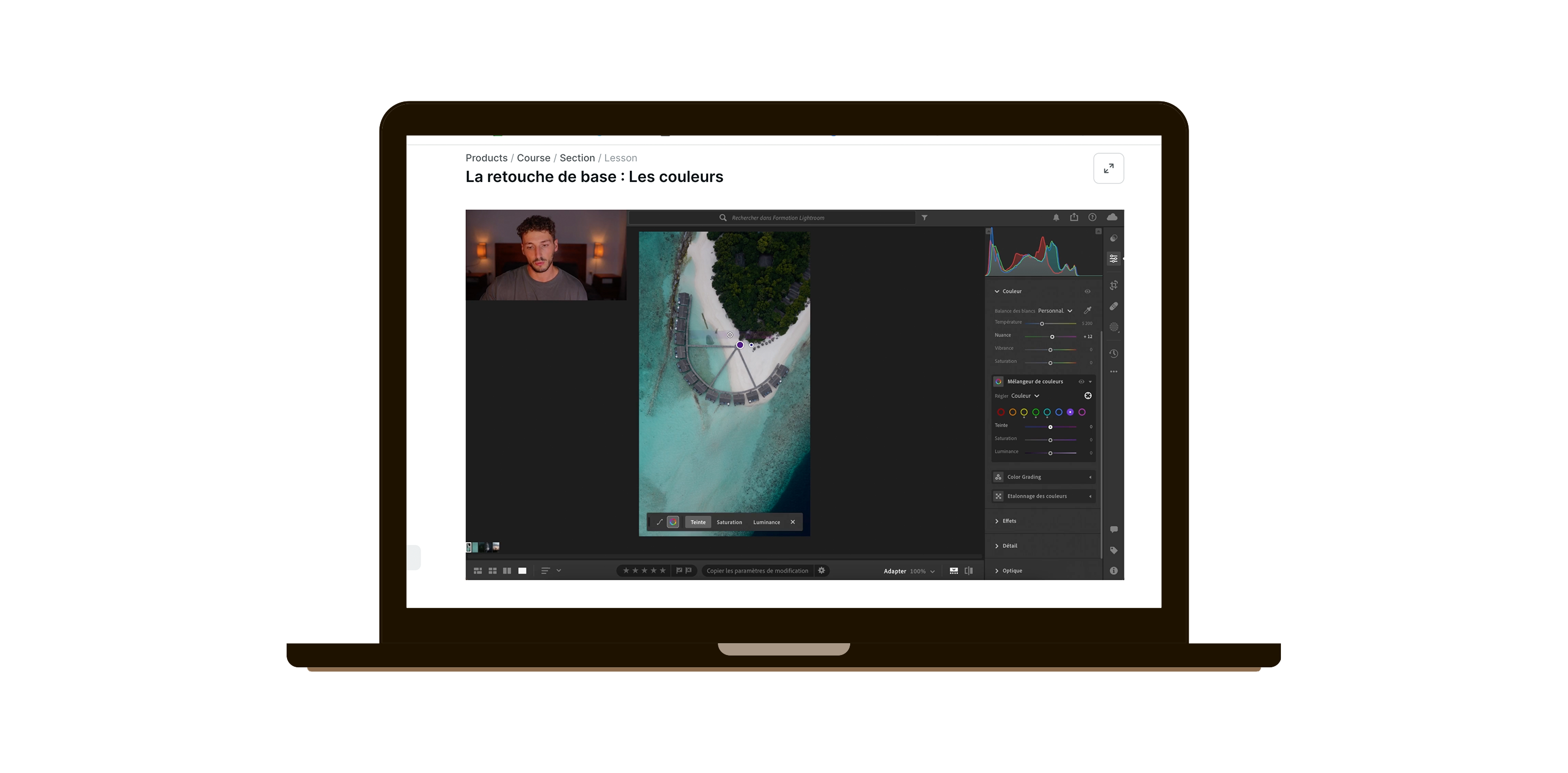 La formation est divisée en 10 modules qui contiennent plusieurs vidéos qui te présentent tous les réglages de Lightroom. J’ai fait le choix de marquer une séparation entre la retouche de base et la retouche avancée en fonction de tes objectifs et pour que tu ne te sentes pas perdu(e) dans tous ces réglages. Une fois ta commande passée, tu peux choisir librement quand tu souhaites commencer la formation. Tu peux t’arrêter en cours de route, reprendre là où tu t’étais arrêté(e) grâce au curseur de suivi. Tu peux bien sûr revoir les modules au cas-où tu as un doute facilement grâce à la séparation des vidéos.